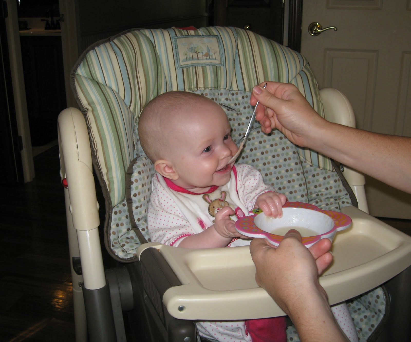 Sophia is six months old today, and the last few days have brought with them a several milestones. As mentioned in the previous posts, she tried rice cereal for the first time about six days ago and really likes it. She continues to have some at lunchtime and dinnertime and nurses regularly during the day. When she eats, she sits with just a diaper on because it makes the clean-up A LOT easier. We are working on keeping her hands out of her mouth while she is eating.