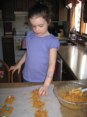 About 1.5 seconds into this project, it became apparent that the actual construction of the nests was NOT going to be a good job for Sophia. She has never been one that liked anything dirty on her hands (always asking for a cloth during dinner to keep her hands and mouth clean), and the gooey butterscotch mixture coating her fingers was just too much for her to handle.