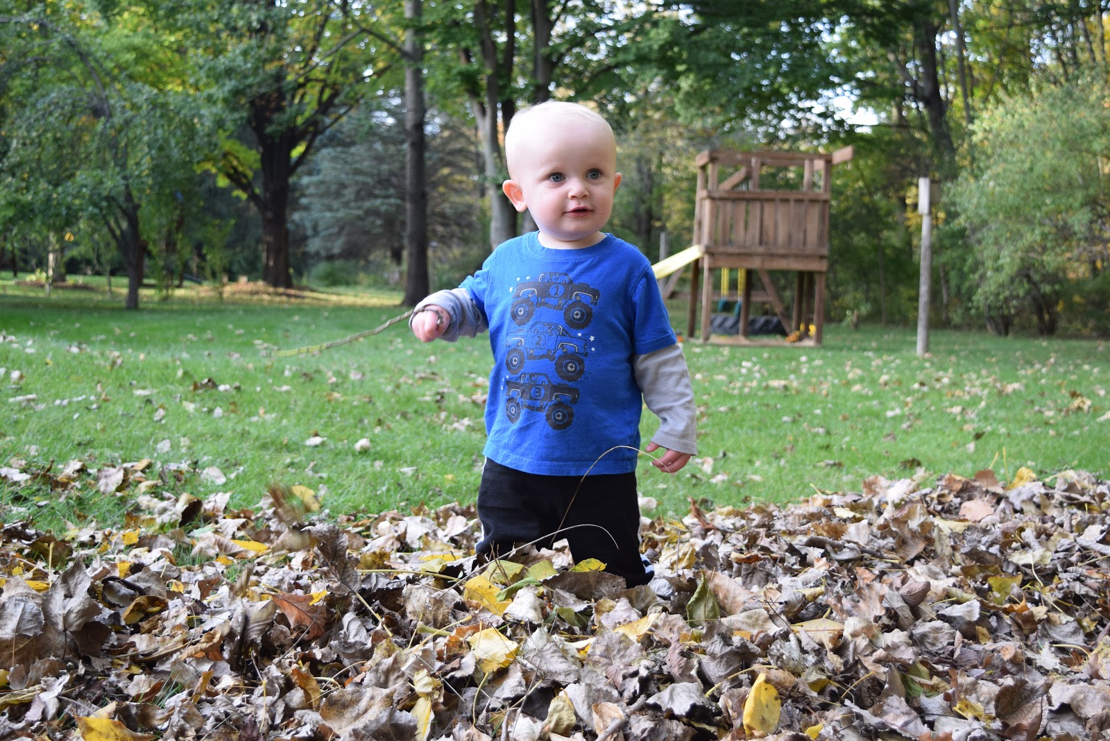 We have quite a few trees in the backyard (because of the woods directly behind us), but not very many in the front. We cut down the walnut tree several years ago and there are pine trees up near the road. For that reason, we are lucky and don't have that many leaves to rake up. The few leaves that fall into the yard are easy to grind up with a few passes on the lawnmower.