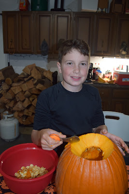 This year, with the garage heated and a table already set up (leftover from the girls' Halloween party with friends), we opted to carve pumpkins out there. It's amazing to look back at last year's pictures and see they kids out on the back deck carving their pumpkins in balmy weather. This year was definitely much chillier and more representative of late October in Michigan.