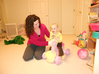 Sophia is just beginning to show an interest in some of Samantha's old "walkers" and push-toys. For the first time, we put her on this horse and she LAUGHED OUT LOUD with pure happiness.